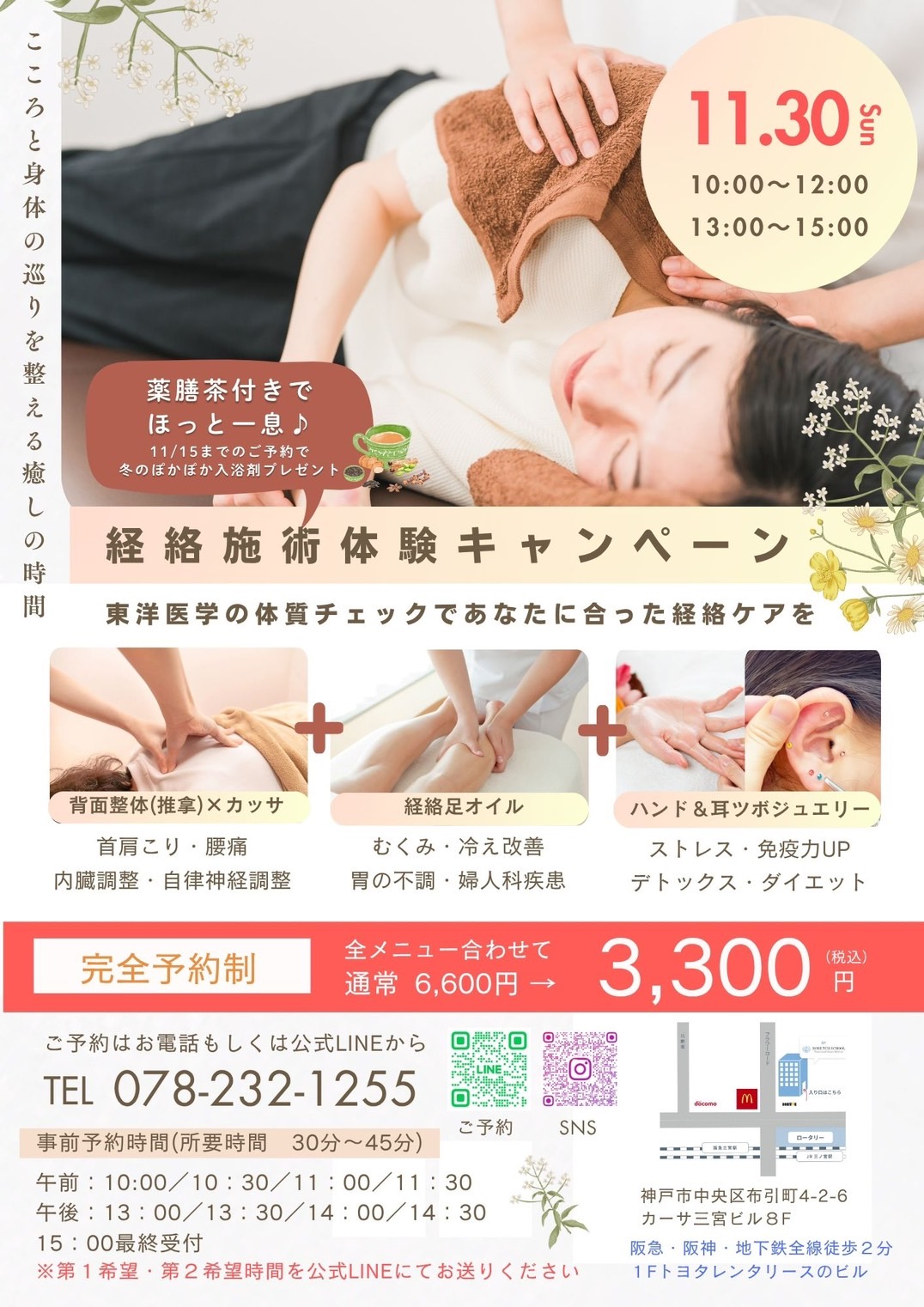 薬膳茶付きでほっと一息♪ 経絡施術体験キャンペーン/11月30日(日)